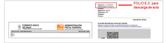 - Es importante señalar que las actas no se envían por correo. Una vez efectuado el pago, debe ingresar a pagafácil, solamente con el FOLIO E.C. se verifica el estatus del pago, si éste está acreditado se habilitará el botón "IMPRIMIR ACTA" para descargar e imprimir el acta desde su dispositivo.